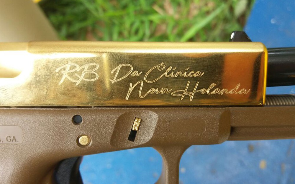 | Pistola dourada com nome da comunidade estava no meio do material apreendido (Foto: Reprodução/Polícia Rodoviária Federal) |